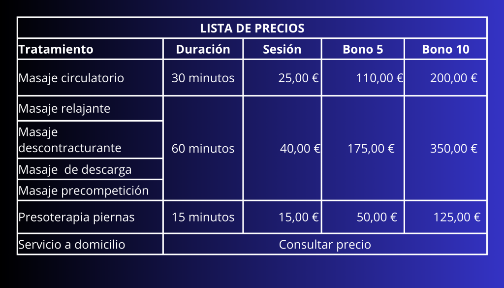 Tienes la opción de contratar una sesión puntual pero también tienes a tu disposición bonos de 5 o 10 masajes para poder beneficiarte de precios más económicos.